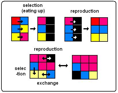 In real life, species do more than prey on each other, they also reproduce and move about, in search of mates or food. But the complementary nature of RPS is retained with this more complex version of the game, and even with a great many more players