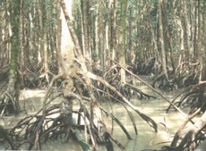 Mangroves are tidal forests that grow between the low and high tide marks in many tropical and sub-tropical areas. Mangroves are adapted to unstable mud conditions and continual tidal flooding. The picture on the right shows breathing