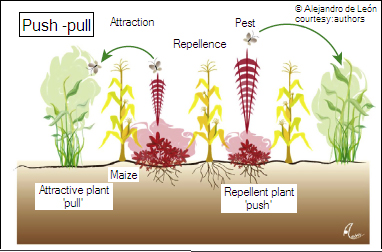 One way natural VOCs are used to control pests is by ‘intercropping’ with plant species that emit VOCs to mimic herbivore damage of the main crop plant, and hence attract, or ‘pull’ carnivores. Or, there could be plants that exude repellent VOCs to expel