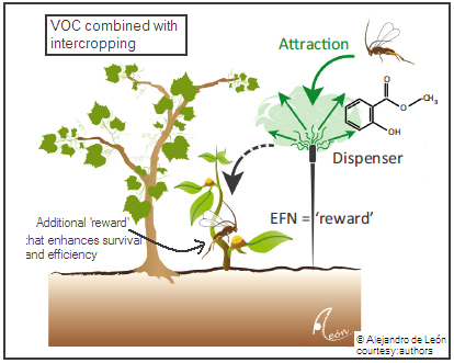 or ‘push’ herbivores away to neighbouring fields. Another strategy, of using artificial VOC dispensers has been refined to the ‘attract and reward’ scheme (see pictures), where a combination of VOCs and EFNs provide higher efficiency.