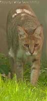 The jungle cat can be distinguished from other wild cat species within its range by its long legs and uniform coat colour, which ranges from sandy yellow to reddish brown. On closer examination, the adult jungle cat can be seen to have faint stripes on the legs and tail, which is tipped with black. On the head the nose and chin areas are often white, the rather large ears tipped with darker fur and in certain sub-species faint ‘tear stripes’ are noticeable beneath the eyes. As kittens, jungle cats are heavily spotted but these juvenile markings are generally lost at about six months of age.