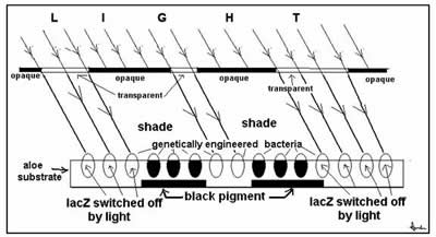 that contains a gene called lacZ, which makes it capable of producing a black pigment. The bacterium was then made light sensing by adding a gene from a light sensitive organism called cyanobacterium, using methods of genetic engineering.