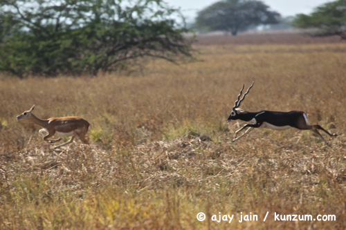 A male Blackbuck chasing a female. Will he get her? I happened to call upon the Blackbucks during their peak fawning period of March - April (the other being September - October), and such sights were quite common.