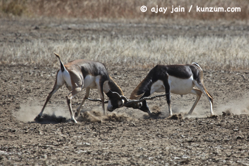 Two male Blackbucks locking horns, possibly over the right to win a female. When the males are not mating, they are locking horns to get the women for themselves. More than a pair were spotted fighting by me. Each male