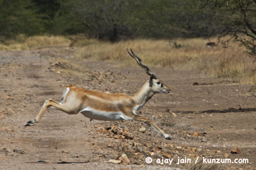 A female black buck fleeing; I could have looked at Blackbucks for hours. Even they would not stop looking at me - curious about the Martian in their land. But a single step in their direction, and they would flee.