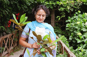 ( Photograph of lady admiring Magnolia flower at Naggar, Himachal Pradesh: Susan Sharma)