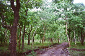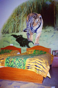 The most beautiful part was the lifelike painting of the white tiger on the back  wall.   A small restaurant for highway travelers, in addition to a Gazebo serving up a choice of Indian and continental meals for the in house customers, completed the list.  It was very much unlike my past experiences in a forest area. With the YHA treks, all you had was a sleeping bag inside a tent and a backpack carrying your own pots and pans, the forest for a toilet and a very basic meal of chappatis, some vegetables and lentils.