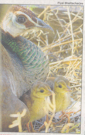 It is that time of the year when peahens lay their eggs and incubate them for about 29 days before the eggs hatch.  The little chicks are timed to come out just as the monsoon arrives in North India.