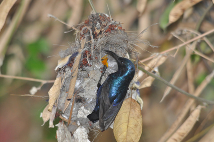 of the breeding cycle of the purple sunbird. That day she brought more nesting material and started to prepare a nest.