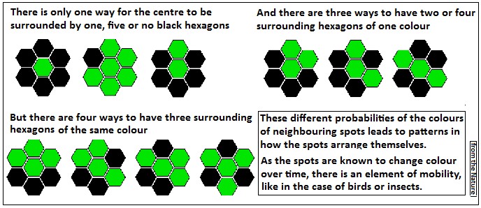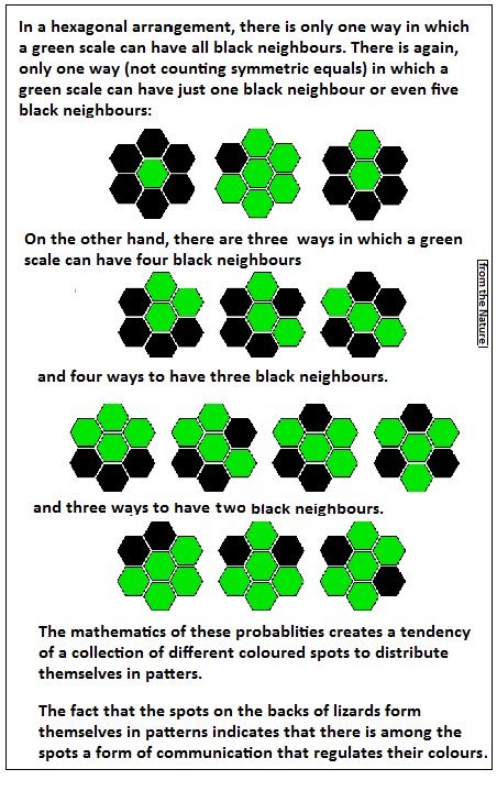 This kind of statistical thinking helps explain certain other natural phenomena of distribution of independent units along patterns, like the spots on some lizard species. The spots are found to change colour, over time, in a way that depends on the colour of neighbouring spots. Now, if the spots are viewed to be distributed in hexagons, it can be shown that the most likely neighbourhood is one with three neighbours of a different colour. This then becomes the rule for each spot and each of the neighbours to follow, and the result is a ‘labyrinthine’ pattern whose origin it is difficult to explain in any other way.