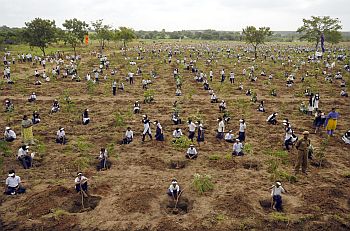 School-children plant trees as they take part in a "One day - One lakh plantation programme" on the outskirts of Hyderabad. Is this the way we should plant trees?