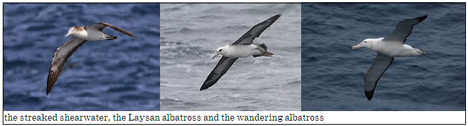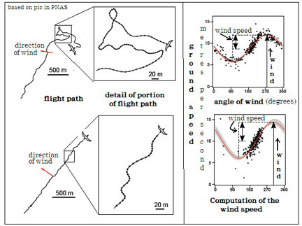 The shearwater and the albatross are suitable because they carry out soaring flight which is largely wind dependent. The estimation of the wind speed is based on the fact that the ground speed is the highest with a tail wind and the least with a head wind,
