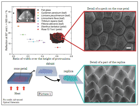 The experimenters copied the micro-pattern of the petals’ surface onto a silicone polymer mould. The mould was then used to create the same pattern on the surface of a glass substrate, as in the lower half, picture 1, The reflection properties of this