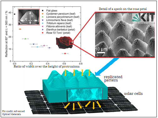 Solar Energy and Hydrogen Research, Stuttgart, report in the journal, Advanced Optical Materials, that they have been able to isolate and reproduce the surface structure of the petals of the garden rose to create a surface that helps solar cells reduce how