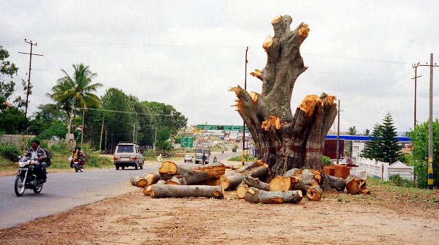 huge, trees lying uprooted on either side  of the road. The trees must have been at least 50-60 years old. “They have been cut down for making a four lane highway”, Marisami our cab driver (Yes, I could not overcome the desire for comfortable travel by cab, instead of changing four buses to travel 250 kilometers to Bhagamandala) told me, on enquiry. What if a human being was killed before his lifetime, that is a crime, but about killing a tree that still has a long life before it?