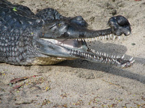 Usually found in Indus, Brahmputra, Ganga and Mahanadi river systems it is adapted to calmer waters of deep rivers. These animals are slow on land and come to sandbanks to bask in the sun or lay eggs.  Unlike other crocodiles the ghariyals have a long snout with a bulbous tip on the males resembling a pot or ‘ghara’. It has razor sharp teeth for eating fish. The ghariyal is one of the largest species of crocodiles comparing to the Nile crocodile. It can reach the length of 5 meters, sometimes even 6 meters. The young ones eat larvae, insects, and frogs. However adults are mainly fish eaters and sometimes scavenge on dead animals. Breeding begins in the winter months of November, December and January; nesting is in the dry season of March, April and May. They lay about 30 to 50 eggs, which hatch in about 80 to 90 days. The eggs are laid in sandbanks by digging the soil and covering it from predators.